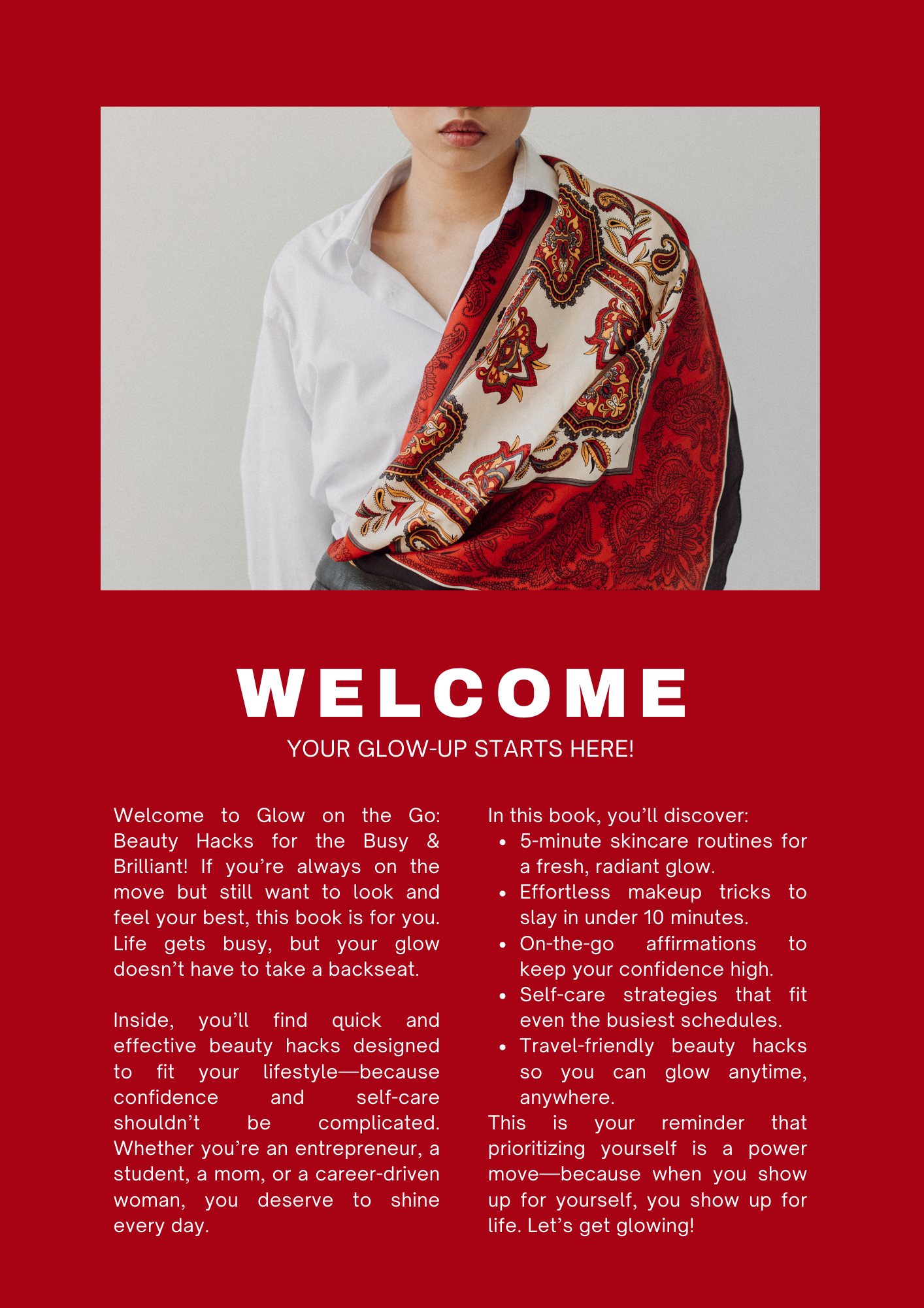 Whether you're traveling across the globe or rushing between meetings, maintaining your glow doesn't have to be a struggle. Glow On The Go is a digital eBook packed with practical skincare and beauty strategies designed specifically for women on the move. This beautifully designed PDF download offers expert tips, minimal packing checklists, product recommendations, and time-saving routines to help you feel refreshed, confident, and radiant—anytime, anywhere.
